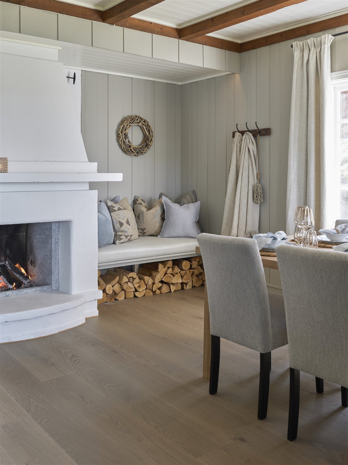 Med stora fönster och fri utsikt mot fjorden råder det ingen tvekan om vad som inspirerat paletten i detta avsnitt. Halvor Bakke har valt ljusa, naturliga toner: beige, sand, ljusblå och vitt – en palett som speglar sommarhimmel, strand och hav. Mitt i det hela ligger BOENs Ek Sand – ett äkta, oljat ekgolv med ett varmt, sandfärgat uttryck. Den solida Castle-plankan, hela 209 mm bred, ger rummet en exklusiv och tidlös känsla och förstärker intrycket av rymd och harmoni. Det är ett golv som inte imiterar trä – det är äkta trä, med all den djup och karaktär som naturmaterial för med sig.